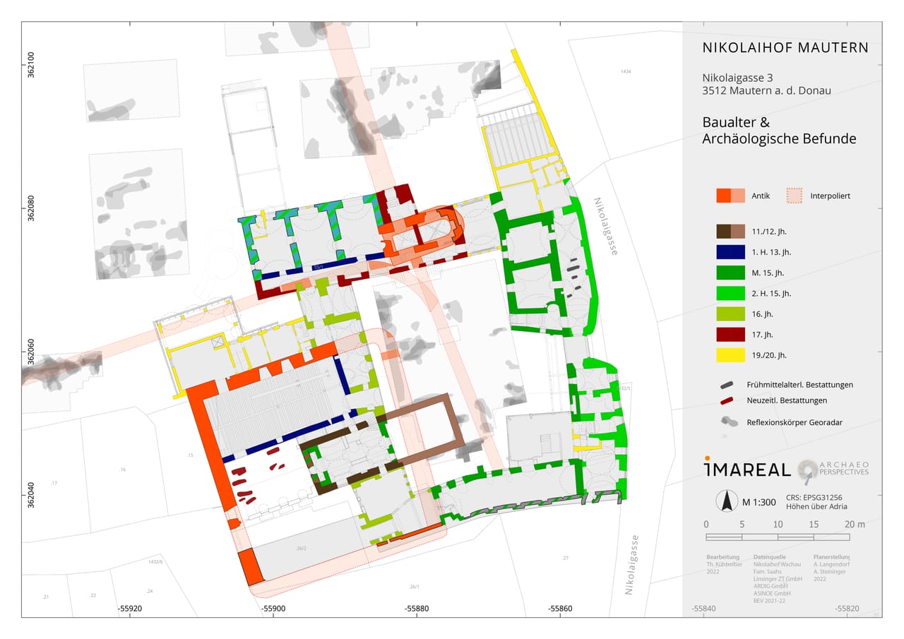 Mit der bauhistorisch belegten Verlegung der Stadtmauer nach O im 15. Jh. bestand auch die Möglichkeit zur Erweiterung des Klosterhofs bis auf jene Linie, die heute durch die Nikolaigasse definiert wird. Darauf verweisen nicht nur die (Um-)Baumaßnahmen in den 1440er-Jahren, sondern auch die aus spätgotischem Zwickelmauerwerk bestehende Bausubstanz des S- bzw. südl. O-Trakts mit den in den Rechnungen genannten Stallungen und Speicherböden für Getreide. In diesem Zuge entstand auch die neue Hauptzufahrt von O, die ursprünglich durch einen Torturm baulich akzentuiert war. Reste dieses Turms sind noch im Dachraum erhalten. 1495 erhielt nach Ausweis der Dendrodaten die Agapitkapelle einen neuen Dachstuhl, der in die W-Mauer einbindet. Auch der Einbau des spätgotischen Netzrippengewölbes fällt in diese Zeit, mutmaßlich auch die bauliche Reduktion des Schiffs, womit die heutige Innenhoffläche geschaffen wurde. Für das Jahr 1517 sind nicht nur weitere Adaptierungsarbeiten an den Wirtschaftsbauten überliefert, sondern die (Um)Baumaßnahmen an der „Sakristei“ korrespondieren mit der Erweiterung des W-Trakts nördl. des Saalbaus bis zum N-Trakt, die über Dendrodaten aus dem Dachwerk in dasselbe Jahr datiert werden können. Um die M. d. 16. Jhs., der dendrochronologischen Datierung der hölzernen Stützsäulen für den zentralen Unterzug um/knapp nach 1557 wurde der Saal im OG des Saalbaus in einen Getreidespeicher umgebaut, worauf auch die kleinen, querrechteckigen Fensteröffnungen hinweisen. Nach 1589 wurde die hofseitige Front des Saalbaus durch einen Vorbau an jene der Kapelle und der nördl. anschließenden Durchfahrt angeglichen. Darüber hinaus wurde im 16. Jh. der kleine Innenhof westl. der Agapitkapelle als Bestattungsplatz genutzt. Grabplatten, die sich heute in der Pfarrkirche von Stratzing befinden, vormals im Aldersbacher Hof in Gneixendorf verbaut waren und Hofmeister und andere Geistliche von St. Nikola inschriftlich nennen, könnten ursprünglich diese Gräber bedeckt haben (Zajic 2008, Kat.-Nr. 322, 323, 335, 342, 358). Ebenfalls in das sp. 15.–16. Jh. fällt die Unterkellerung des W-Trakts, worauf das Zwickelmauerwerk und die Ziegelgewölbe zeitlich verweisen.